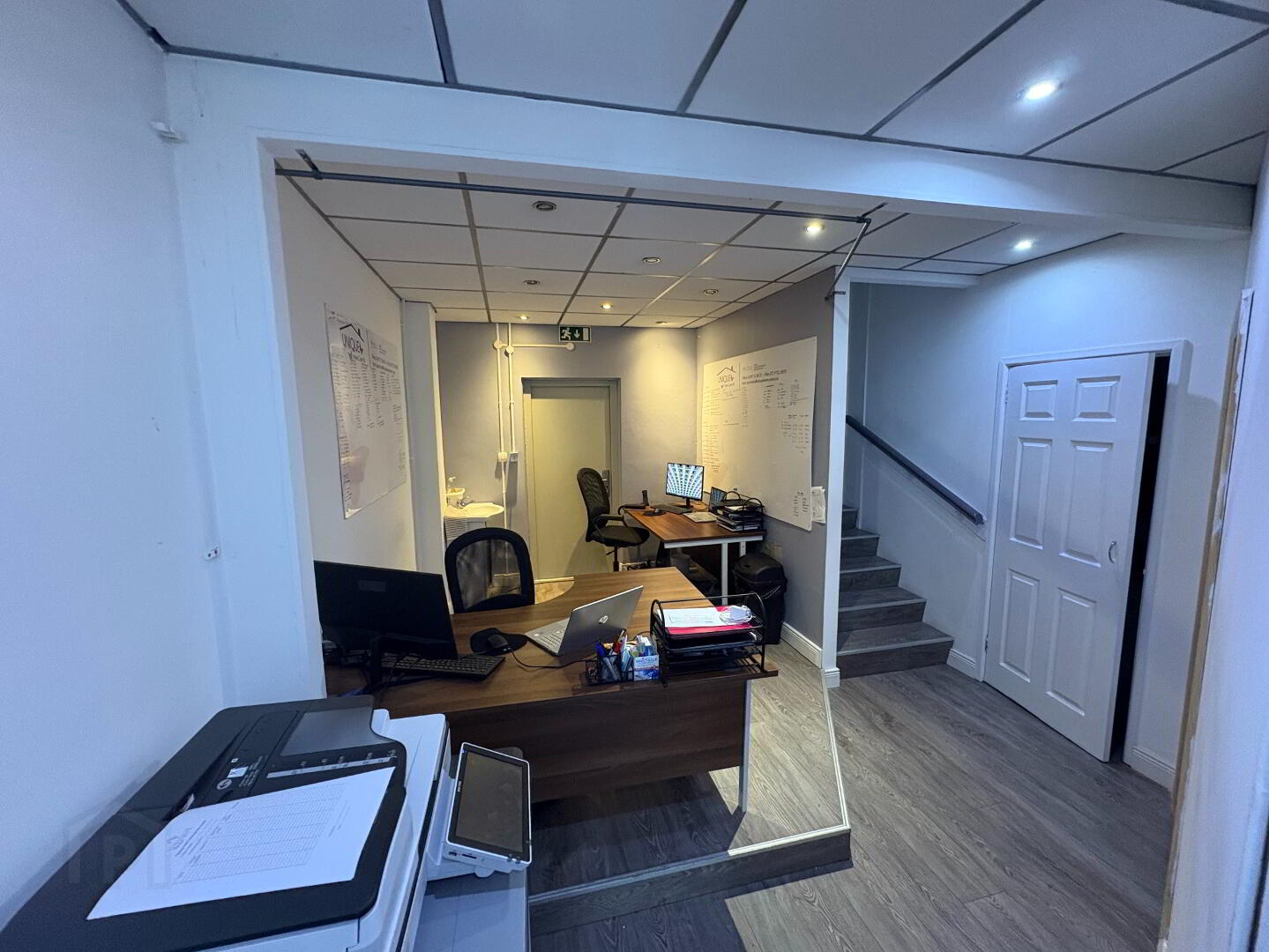 The ground floor provides an open plan sales area with understairs storage. Stairs lead to the first floor which is divided into four office rooms and WC.
