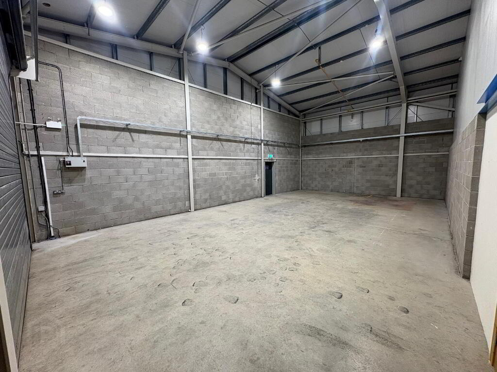 The warehouse is finished to include concrete floor, part block walls/metal sheet cladding and corrugated clad roof with Perspex roof lights and suspended lighting.