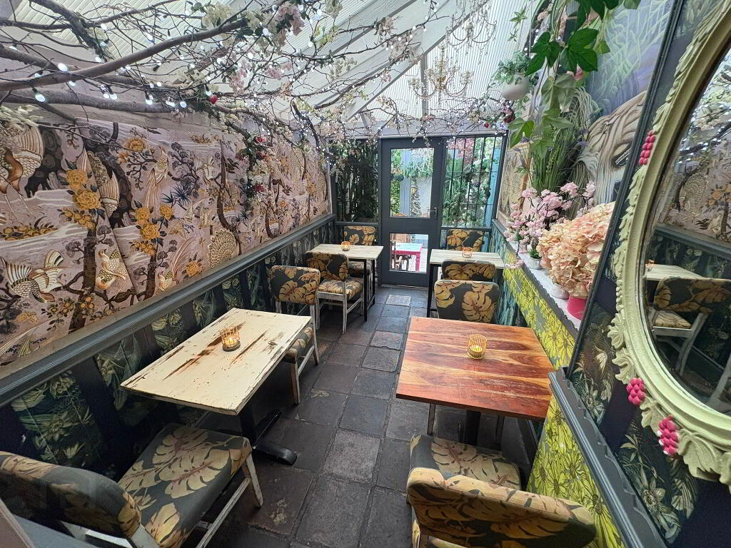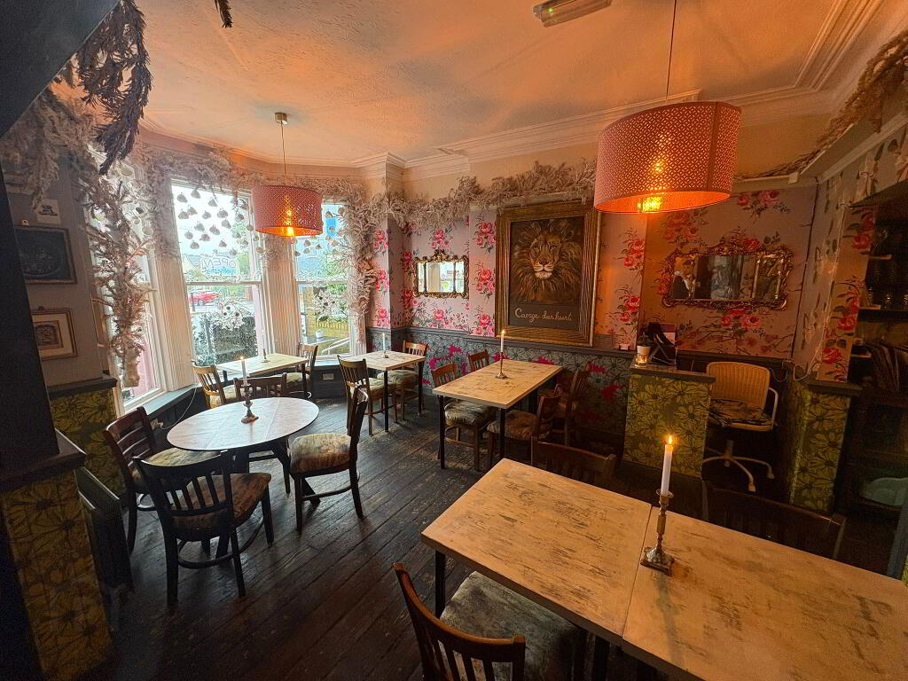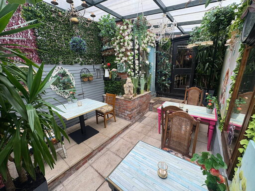 Three-storey premises with kitchen and bar area at ground floor level, complete with customer seating and an enclosed garden dining area.