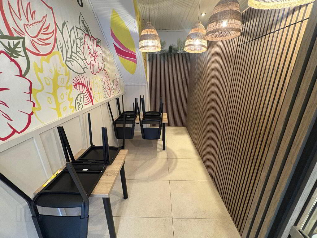The unit is finished in a traditional style to include wooden shop front, hardwood floor to servery, non-slip floor finishes to preparation area/kitchens, plastered and painted walls and wooden sheeted ceiling with feature lighting.
