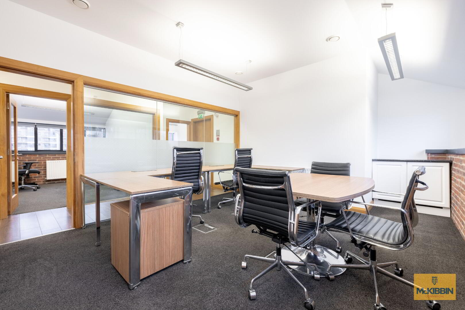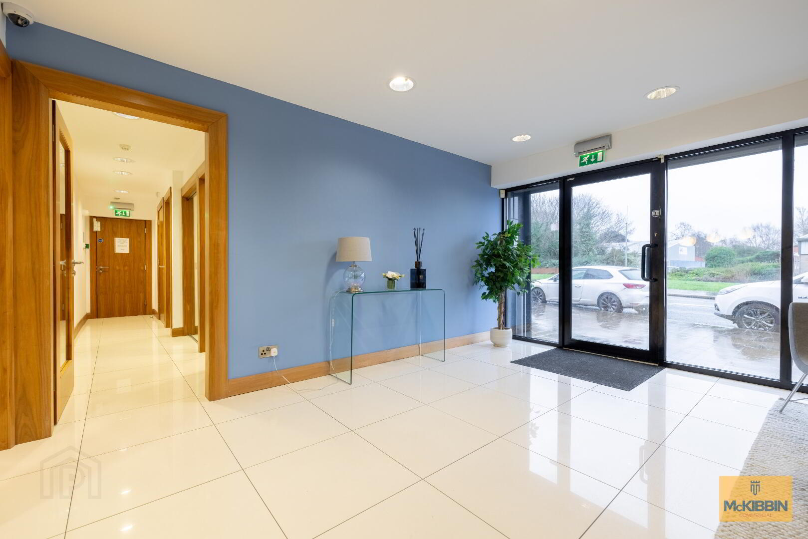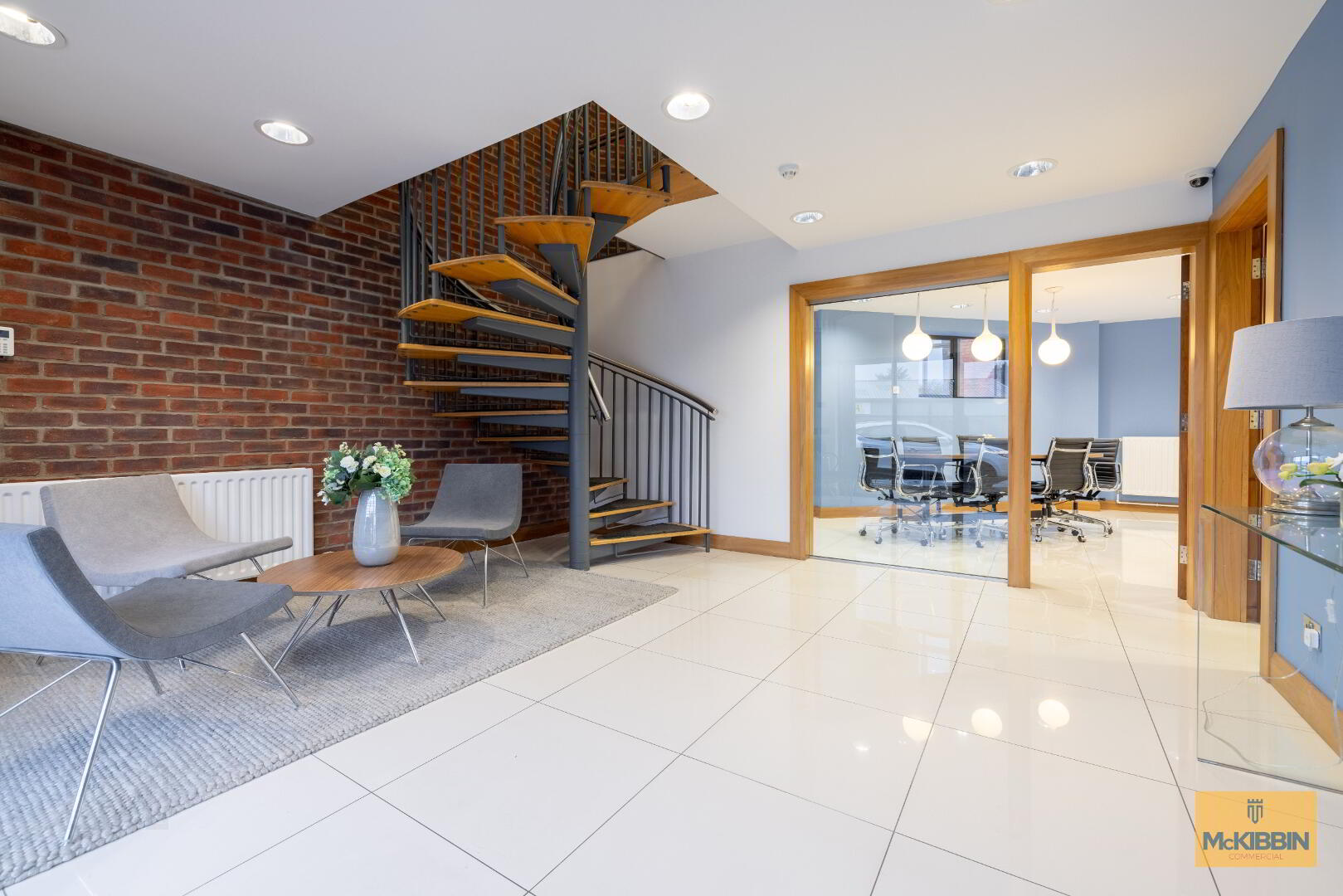 The attractive entrance foyer leads to a meeting room, comms room, kitchen, WC’s and garage. A staircase leads to the first floor, which is where the office accommodation is arranged.
